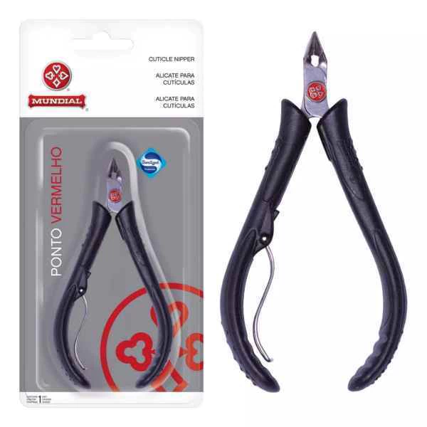 alicate 171-pv mundial, alicate para uso pessoal, alicate com cabo plástico, alicate com proteção antimicrobial, alicate mundial vermelho preto, alicate leve, alicate de cutícula ergonômico