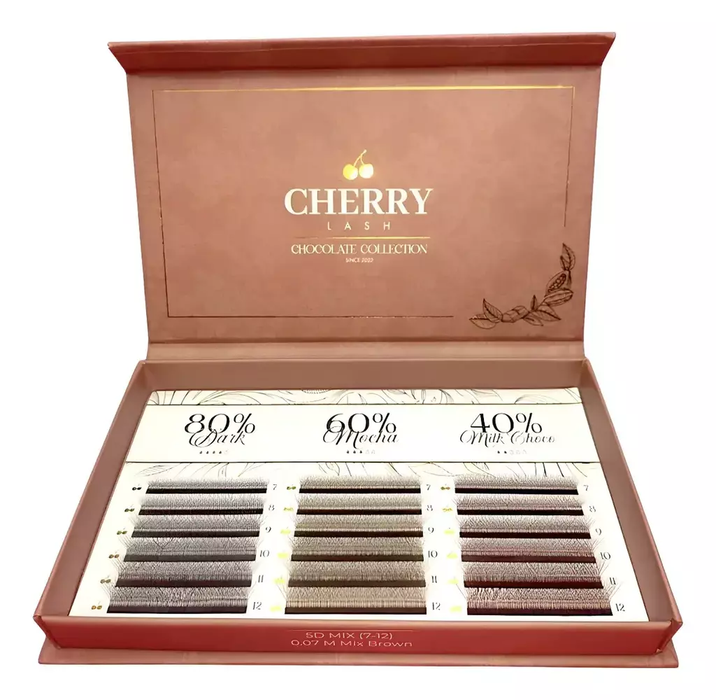 Para a lash designer que deseja entregar um olhar intenso, mas com suavidade e sofisticação, os Cílios Cherry Lash 5DW da linha Chocolate Collection são perfeitos. Com fios na tonalidade marrom, eles oferecem um acabamento moderno e delicado, ideal para clientes que buscam naturalidade com destaque.