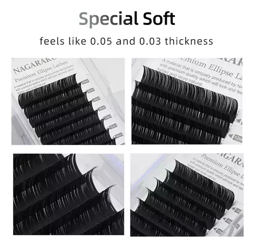 Diferente dos fios tradicionais, os cílios Ellipse têm formato achatado, semelhante a uma folha de papel, que proporciona maior área de contato com o fio natural, resultando em fixação mais firme e duradoura. A ponta dividida (ponta dupla) garante um acabamento leve, elegante e com volume visual mais cheio, sem sobrecarregar os cílios da cliente.